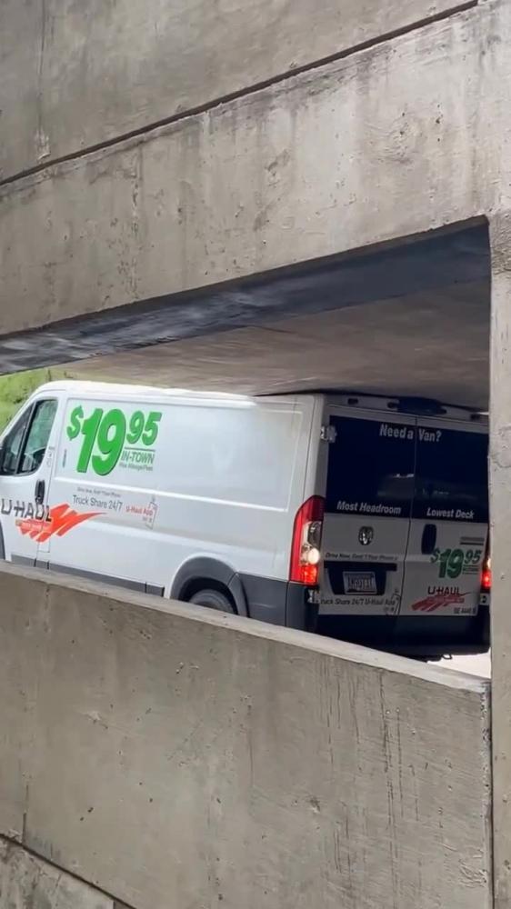 Řidič dodávky U-Haul poškodil střechu po vjezdu do nízkého parkoviště