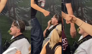 2022, Brighton, Spojené království: Požití nadměrného množství halucinogenních látek vyvolalo u mladíka potřebu konzumace okolního travního porostu. Video pochází z festivalu Boundary Brighton.