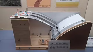Model znázorňující, jak a proč dochází k zemětřesením při střetu tektonických desek. Scénář takových otřesů je zhruba stejný: jedna deska prochází pod druhou a v určitém okamžiku jedna z nich "ricochetuje". Tento mechanický model byl sestrojen v Přírodovědném muzeu Wakayama v Japonsku.