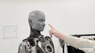 Muž se pokouší komunikovat s humanoidním robotem Ameca od britské společnosti Engineered Arts. Pokusí se dotknout jeho nosu, ale robotovi se to nelíbí a odtáhne muži ruku.