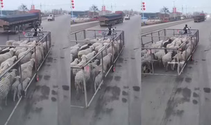 Pastýř převáží své ovce v pojízdné ohradě na kolečkách.