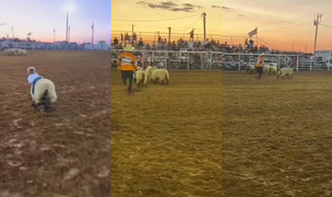 Chlapec snažící se udržet na ovci.