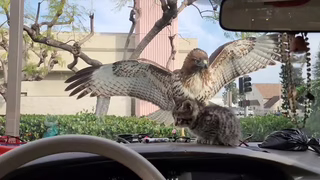Na parkovišti u McDonald's v Los Angeles seděl muž v autě s koťátkem, když najednou na jeho přední sklo zaútočil jestřáb a pokusil se mu malého mazlíčka sebrat.