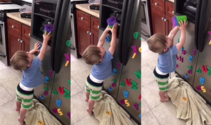 Chlapec se snaží dostat vodu z lednice do plastového kelímku a napít se...