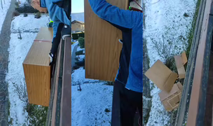 Pokus o vynesení velké skříně pomocí lana z balkonu.