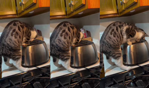 Kočka Maggie hledá něco v topinkovači v kuchyni a její majitelka si myslela, že si s přístrojem jen hraje...