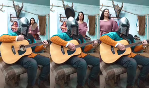 Muž v rytířské helmě hraje na akustickou kytaru píseň "Black in Black" od AC/DC, zatímco ho žena, která se skvěle baví, mlátí pánví do hlavy jako na bicí!