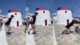 Ve vesnici Astypalea v Řecku předvádí Shea Rudolph, člen týmu Twin Parkour, působivé salto vzad na úrovni země.