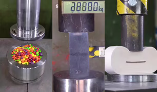 Stlačování nejrůznějších předmětů v hydraulickém lisu.