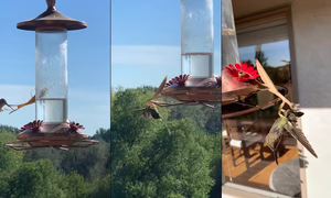 Na krmítku číhá Kudlanka Nábožná, která svýma silnýma nohama zachytí blížícího se kolibříka. Velké kudlanky se mohou živit malými obratlovci, jako jsou ještěrky, žáby, ryby a malí ptáci, stejně jako jejich menší kolegové.